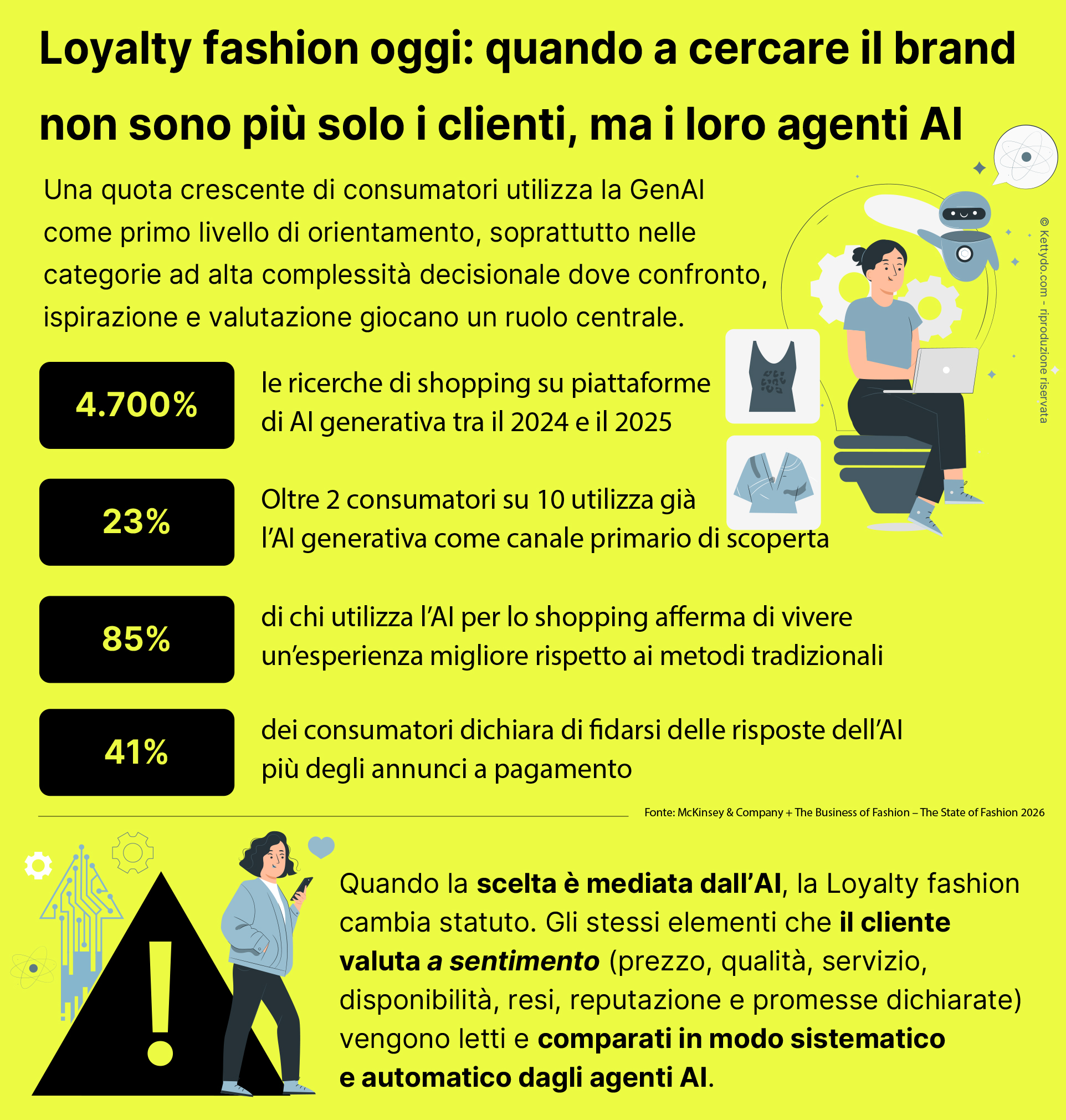 La Loyalty fashion si colloca tra gli status relazionali più sofisticati e complessi perché attiva simultaneamente dimensioni psicologiche, emotive e identitarie che vanno oltre la semplice soddisfazione funzionale. Nel fashion, la relazione non si esaurisce nell’atto di acquisto, ma coinvolge percezione di sé, appartenenza simbolica e riconoscimento sociale. È in queste categorie ad alto coinvolgimento personale che la fedeltà è stata storicamente guidata più da fattori emotivi e relazionali che da incentivi economici o vantaggi transazionali. Oggi, però, questo equilibrio viene messo alla prova da un cambiamento strutturale: una parte crescente dei processi di discovery, confronto e scelta non è più mediata solo dall’esperienza diretta del consumatore, ma anche da sistemi di intelligenza artificiale che leggono, sintetizzano e valutano i brand come insiemi coerenti di informazioni, promesse e comportamenti. In questo nuovo contesto, la Loyalty fashion non riguarda più soltanto ciò che il cliente sente o percepisce, ma anche la capacità del brand di reggere come sistema quando la relazione viene osservata, confrontata e filtrata da logiche algoritmiche.